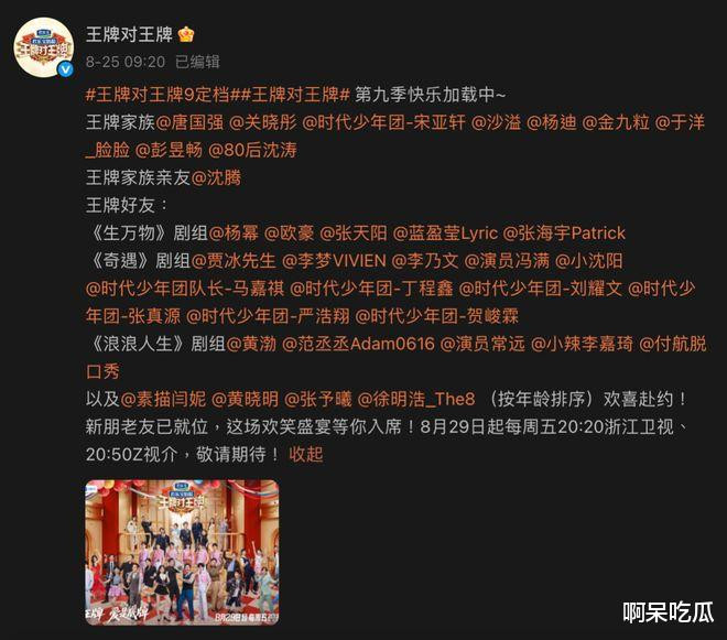 如今,又有一档老牌综艺因嘉宾变动被推上风口浪尖——《王牌对王牌》第九季官宣定档8月29日起每周五晚在浙江卫视播出,但全新阵容却引发轩然大波。